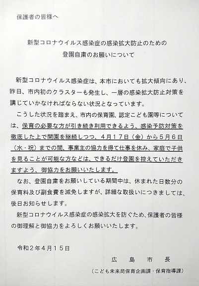 では、末尾に「保育園」、また「広島市の所管施設に関わる「広島市からのリリース」。