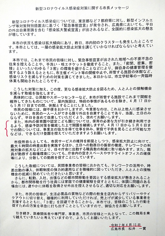 令和2年4月9日の「広島市新型コロナウイルス感染症対策本部員会議」において、本部長である市長から、今月に入って、国から緊急事態宣言を出され、転勤をはじめ、この宣言の対象地域との往来などが関係するとみられる感染症患者が確認されるなど、本市の感染状況は新たな局面に入ってきており、今後、本市が「感染拡大警戒地域」となることも見据えた対応が必要となるとの認識の下、市立学校の一斉臨時休業も含めた措置について、県を含めた関係機関等と協議するよう要請がありました。