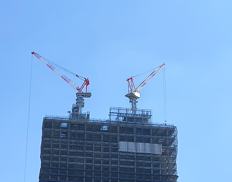 街の頭上には、何本ものクレーンが伸びては自然と目に映ってまいります。