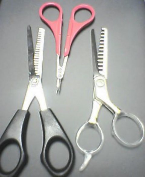 そこで、長年の「感覚」でカットするんです。慣れれば簡単ですよ!ただし、普通のハサミを使用すると切りすぎる可能性も充分にありますので、ご覧の様に2種類の「スキ・バサミ」を用います。