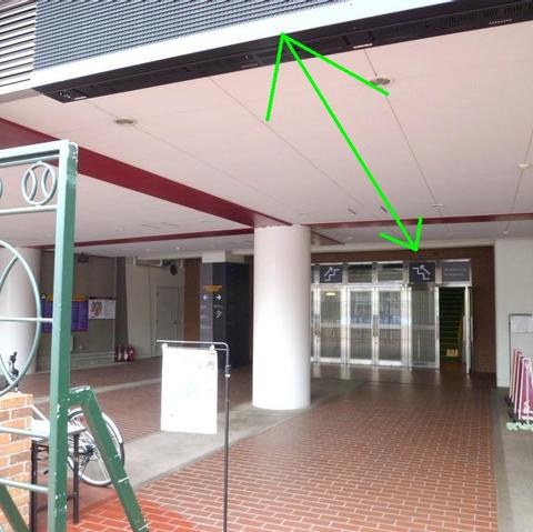 2枚目の写真、矢印の白い天井部分は上記と同場所で、古い球場の玄関に「後から増築」した5階建てスペースの部分です。