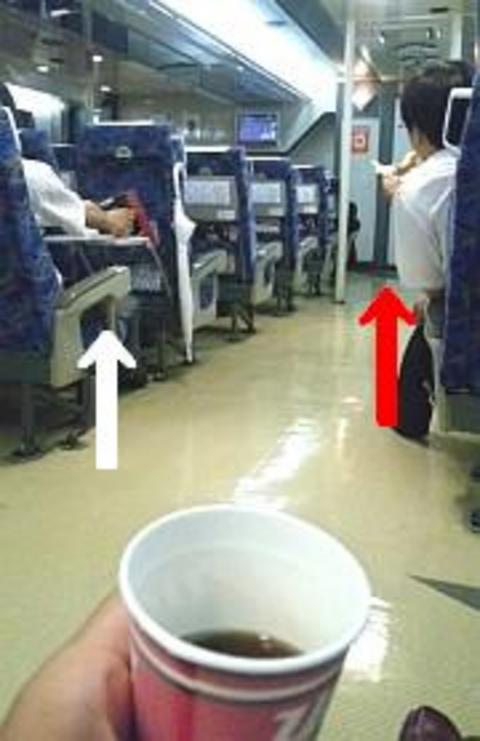 帰路のスーパージェット内で「ホッと一息」のブラック・コーヒーを口にしながら。