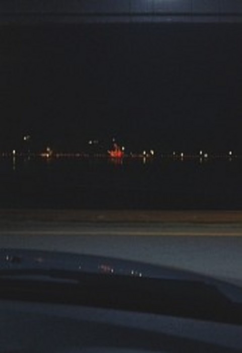 急いで宮島港へ到着したらば、遠くには、夜の瀬戸内海に浮かび上がる朱色の鳥居。