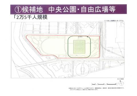 スタジアムを2.5万人規模、4万人規模と落とし込み、いずれも公園内にギリギリ入る。